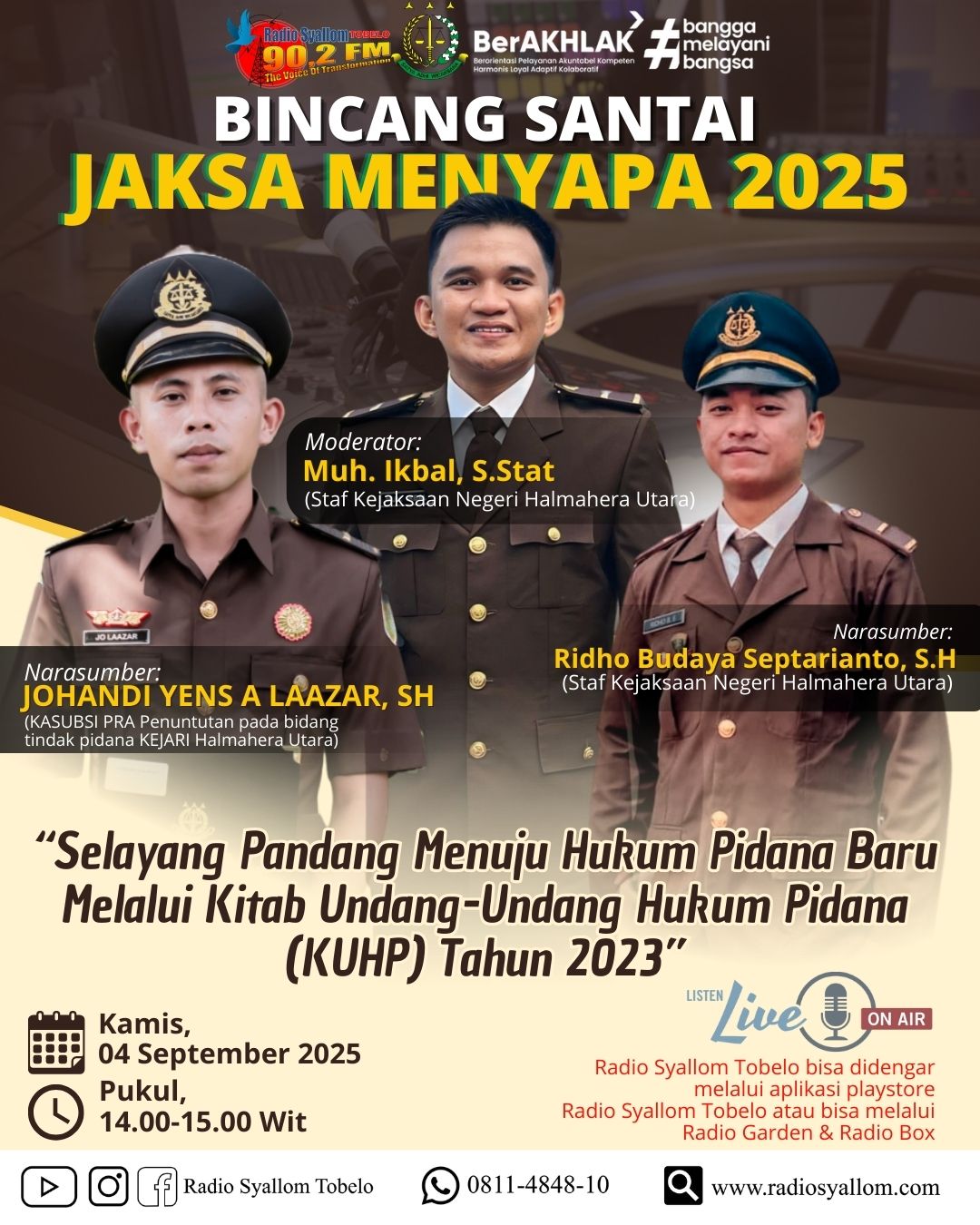 Seperti diketahui acara Jaksa Menyapa di radio Syallom sudah dua kali diselenggarakan. Rabu (27/8) talkshow dengan thema Kekerasan Seksual Anak di Halmahera utara dengan narasumber Dewi Athira Akhsan SH MH (Kasie pidana umum Kejari Halut) dan Kamis (4/9) dengan thema “Selayang pandang menuju penerapan KUHP Baru tahun 2026” dengan narasumber Ridho Budaya Septarianto SH (Staf intel kejari halut)