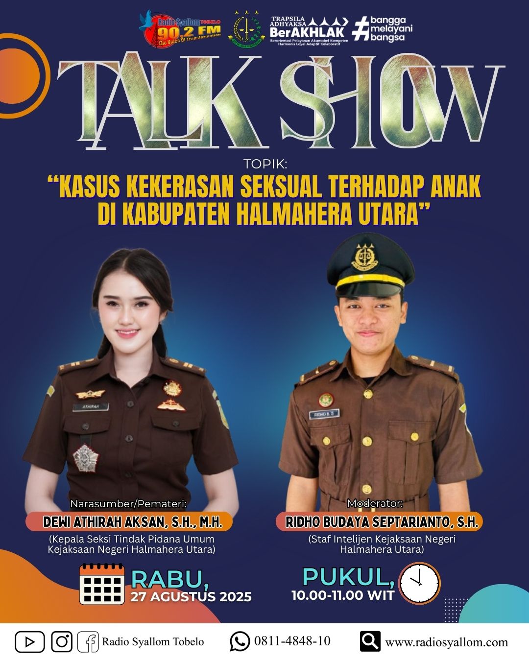 Program acara Jaksa Menyapa ini sudah 2 kali diselenggarakan di radio Syallom yang membahas tentang “kekerasan seksual anak di Halmahera utara” dan thema “Selayang pandang KUHPidan yang akan beerlaku tahun depan”.